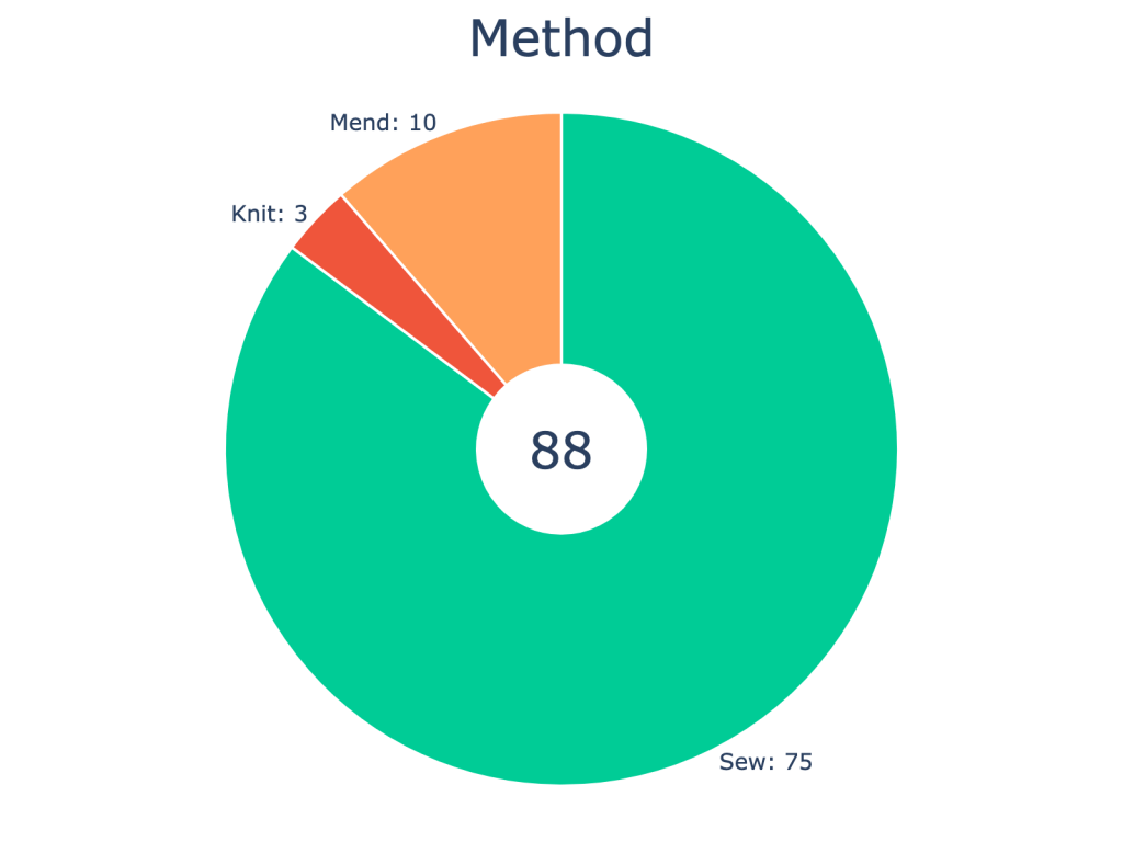 My only goal for 2025 is to continue to think about my workflow and always try to improve my process. Now let’s break down the numbers for 2024: I completed 88 projects this year, including 22 pairs of underwear! The biggest challenge was keeping up with my ever changing body and I’ve mostly coped by living without a lot of items (e.g., hard pants). Thankfully since I work from home, wearing nothing but biker shorts and joggers hasn’t been a problem.