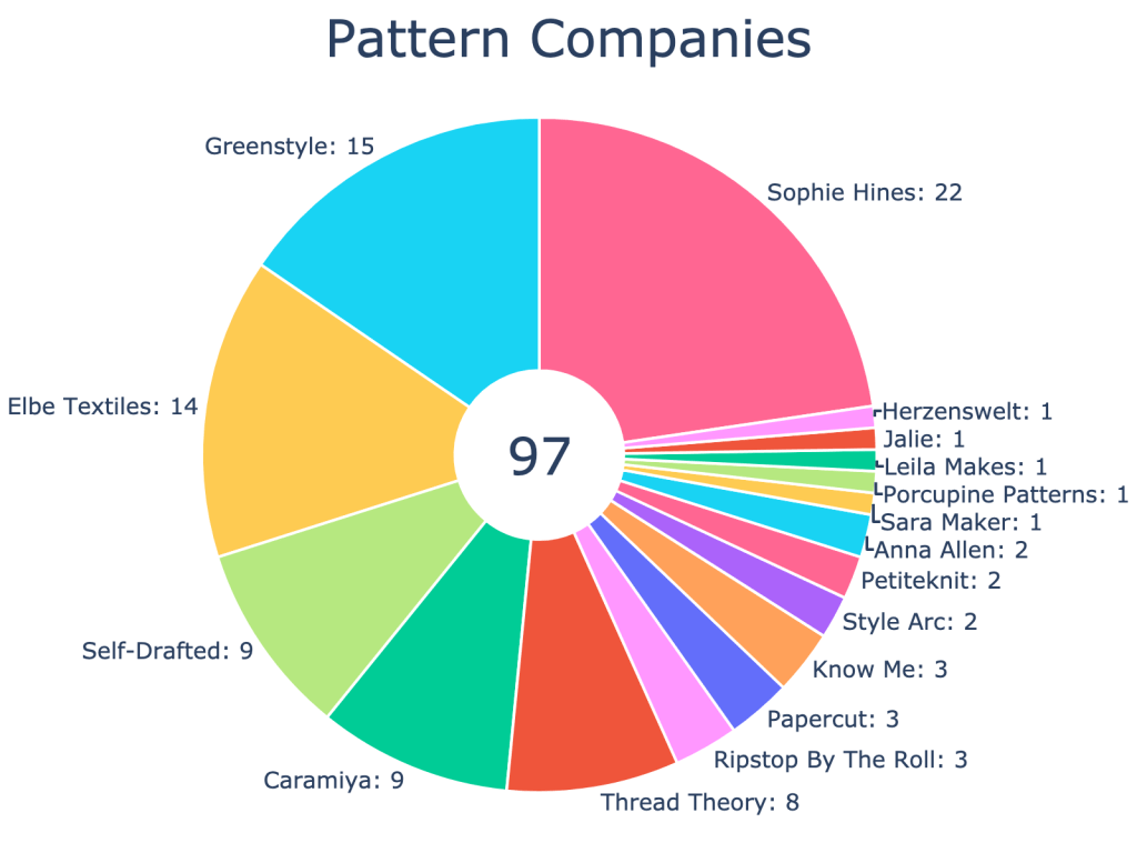 I definitely had a lot of repeat makes this year: 22 Sophie Hines, 15 from Greenstyle, 14 from Elbe Textiles.