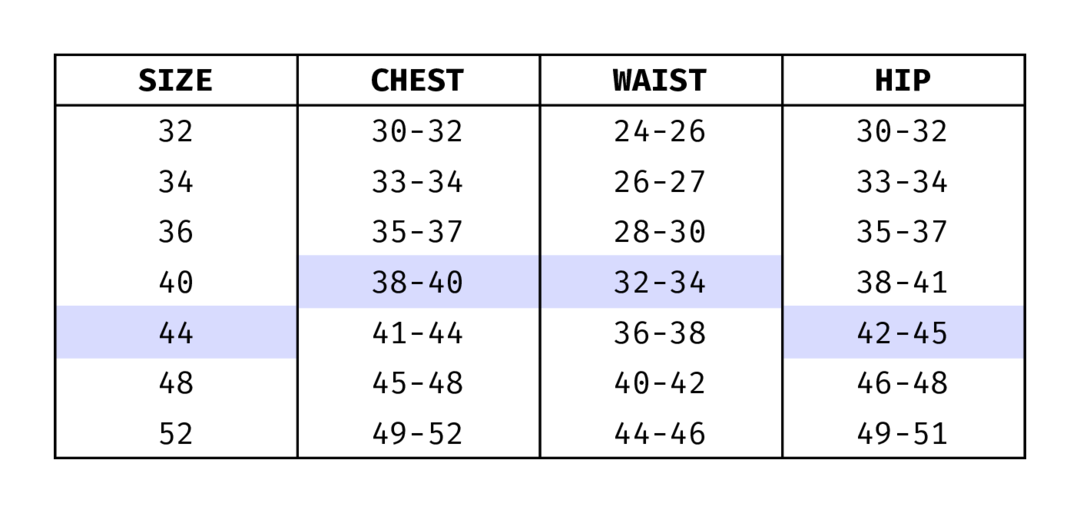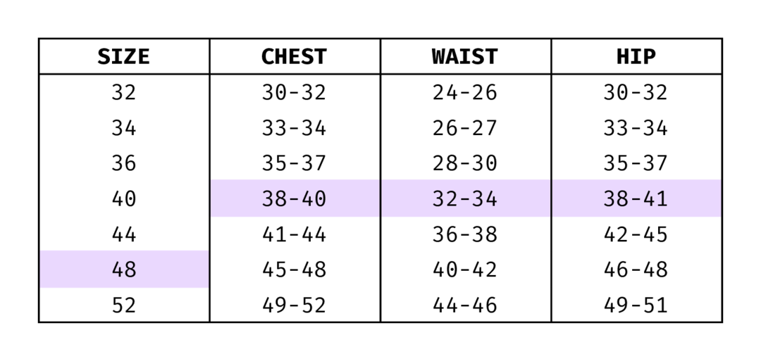 Ryan’s measurements: 39 inches at the chest, 34 inches at the waist, and 41 inches at the lower torso. He tried on my size 44 but found the shoulder was too tight, so I bumped him up to size 48 for more room.