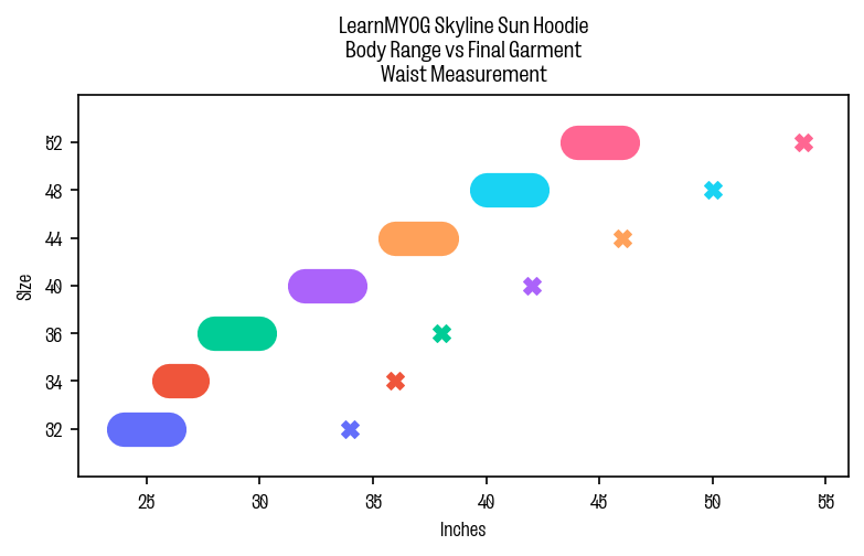 Hip measurements are inconsistent too. The hoodie is supposed to be the same size at the chest and hip, but it feels like the pattern was drafted with the chest in mind first and the hips were added later. The recommended body measurements vary by size, and the ease isn’t consistent either.