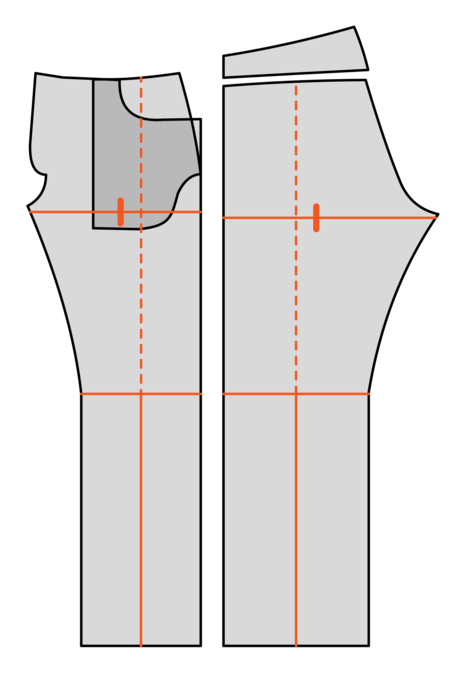 Here I’m showing how to increase circumference, but if you need to decrease it, you’d make the same adjustment in reverse—removing fabric instead of adding it. To maintain a straight side seam, you have to add fabric evenly from the waistline all the way down to the hem, even if you only need extra room in the torso. This widens the pant leg and shifts the drapeline, which is the trade-off. On a contoured pattern piece, by contrast, you can add fabric only where it’s needed—above the horizontal crotchline—while keeping the grainline fixed and the pant leg width unchanged.