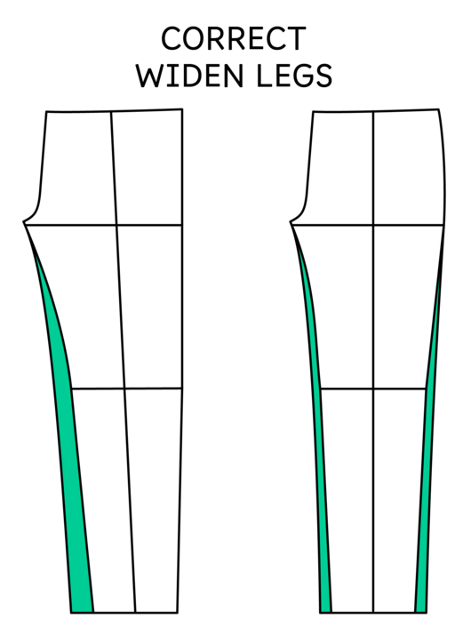 You don’t want to widen the pant leg along the side seam on a straight pattern, because doing so either breaks the straight side seam or, if you carry the adjustment all the way to the waistline, changes the torso width instead.
