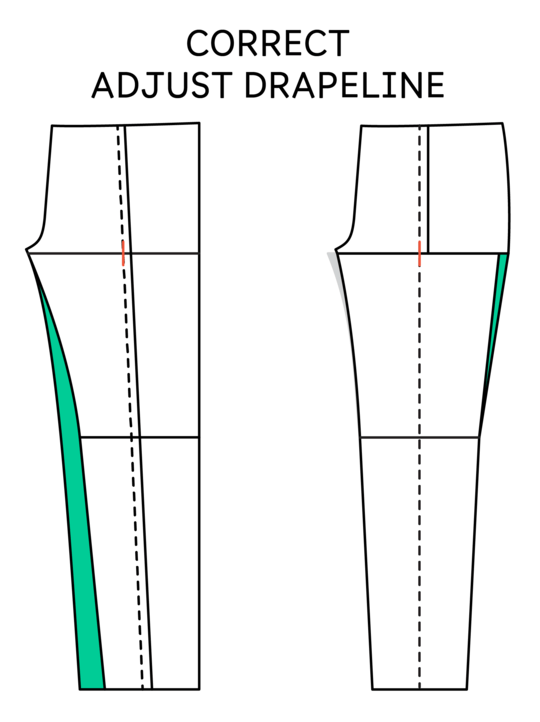 You wouldn’t adjust the drapeline on a straight side seam pattern by shifting the torso, because that would eliminate the straight side seam. And you wouldn’t move the drapeline on a contoured pattern by adding only to the inseam, because that would widen the entire leg.