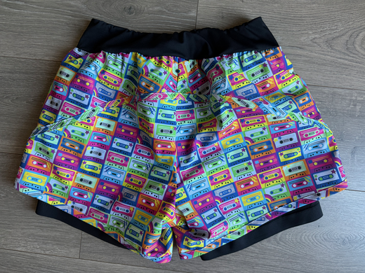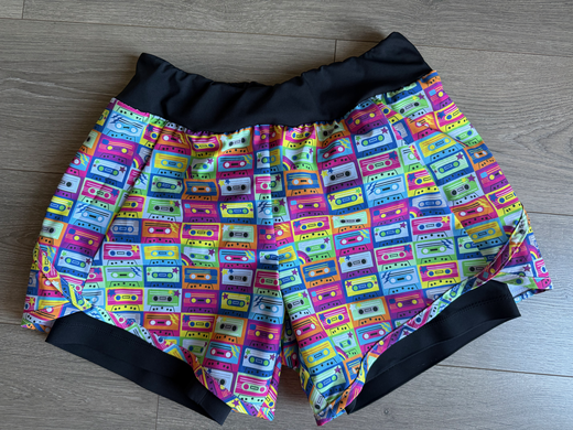 You can make these shorts using stable knits, woven, or stretch woven fabrics. I used a stretch woven for the outer shorts, and classic knit spandex (i.e., leggings fabric) for the waistband and shorties.