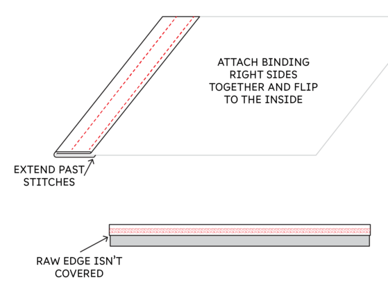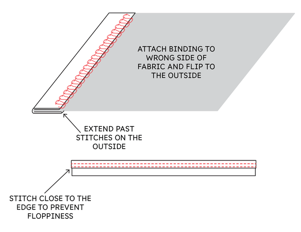My preferred method is to attach the binding to the inside of the garment first. That means the right side of the binding touches the wrong side of the top. Then I flip the binding out to the public side.