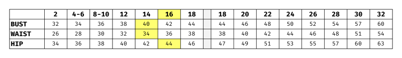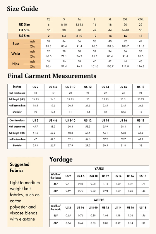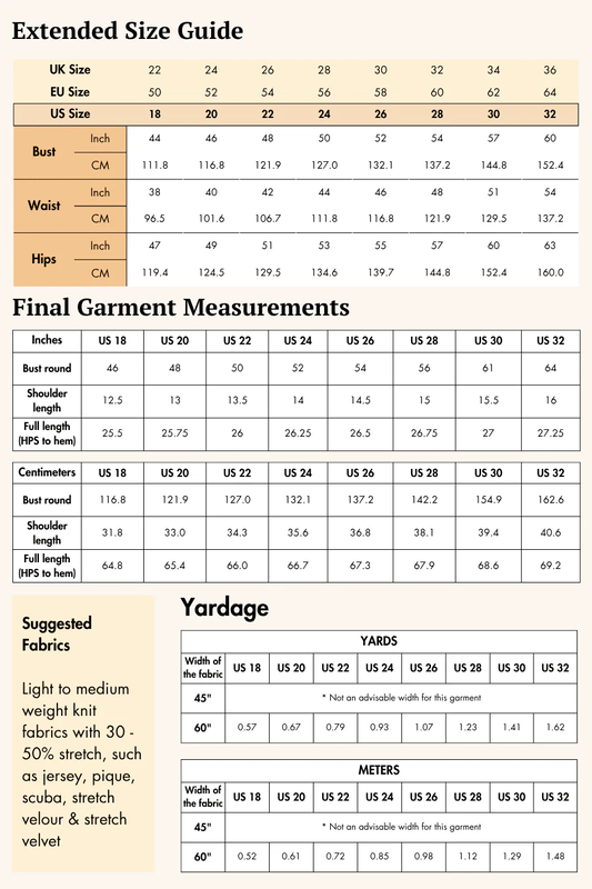 The pattern comes in two ranges. The regular range has busts from 32 to 44 inches, waists from 26 to 38, and hips from 34 to 46. The extended sizes go from 44 to 60 at the bust, 38 to 54 at the waist, and 47 to 63 at the hip. There is no guidance on how or where to measure, or what makes the extended range different from the regular one. Not a great start.