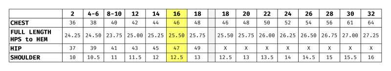 For the chest, I measured across the bottom of the armhole parallel to the floor. For the regular size range, my measurements matched the final garment table exactly. But for the extended size range, I was nowhere close. My measurements were 4 inches larger for sizes 18 through 28, and 2 inches larger for sizes 30 and 32.