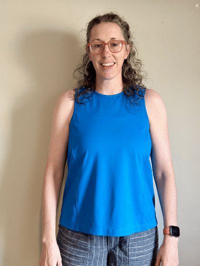A well-fitting, well-constructed tank is every bit as fussy as jeans. Maybe even more so. Working with stretchy knit fabric is a pain. Polyester spandex can be especially tricky to sew. Home machines often struggle to get the needle through cleanly, and skipped stitches are a constant frustration.