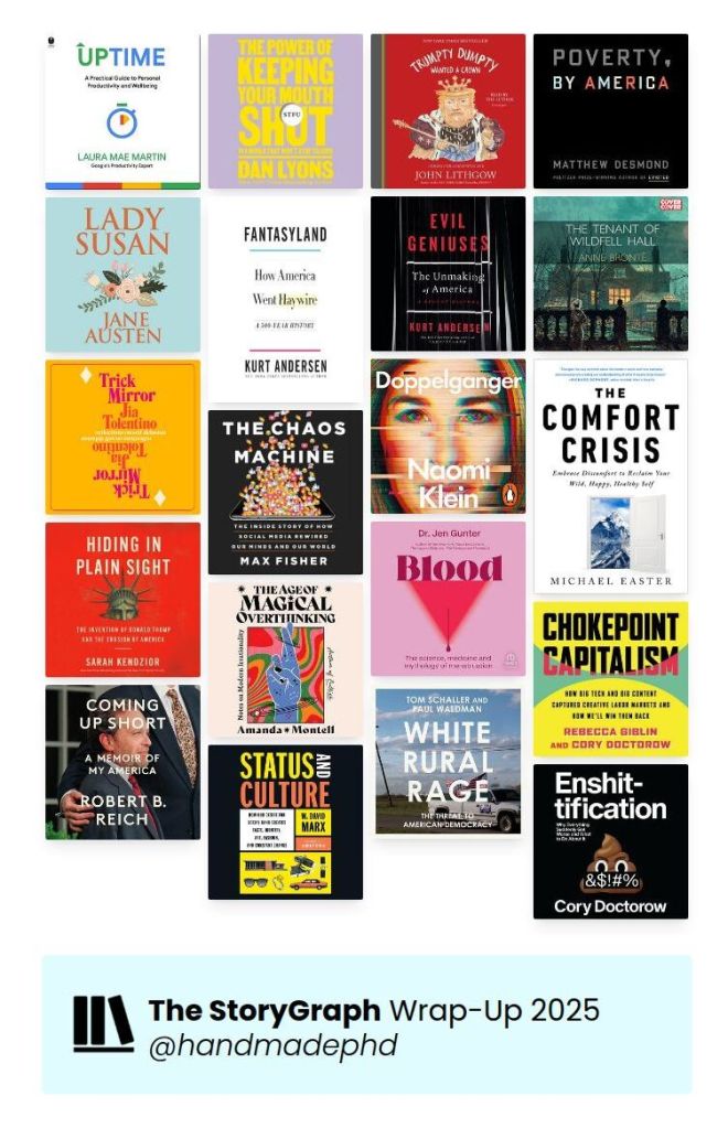 My favorites were Doppelganger by Naomi Klein, The Chaos Machine by Max Fisher, Enshitification by Cory Doctorow, and Hiding in Plain Sight by Sarah Kendzior. I also really enjoyed Trick Mirror by Jia Tolentino, Fantasyland and Evil Geniuses by Kurt Andersen, and Status and Culture by W. David Marx.
