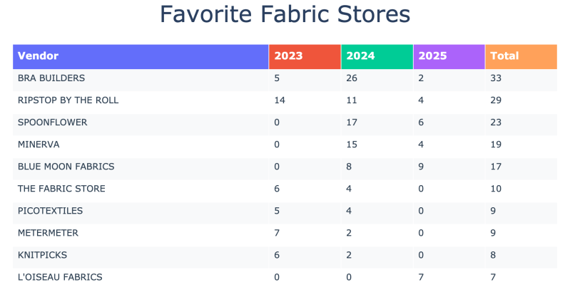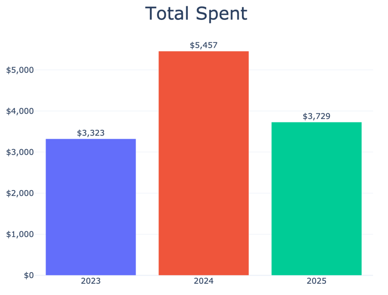 Even with fewer projects, my spending landed slightly above 2023 levels. In 2024, buying the Sailrite LSZ sewing machine pushed my costs way up, so this year looks calmer by comparison.
