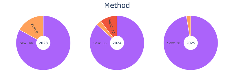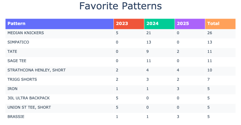 Who I sew for looks more balanced this year. In 2024 I made an overwhelming amount for myself because weight loss meant replacing nearly everything. This year settled into something that feels sustainable. I’ll probably always skew toward myself since I make my own bras and underwear, and Ryan happily buys his.