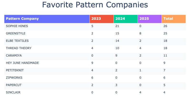 My most used pattern companies line up exactly with what I sew the most: Sophie Hines for underwear, Greenstyle for leggings, Elbe, Thread Theory, and Hey June Handmade for t-shirts, and Caramiya for sports bras. For sweaters, Petite Knit is still my go to.