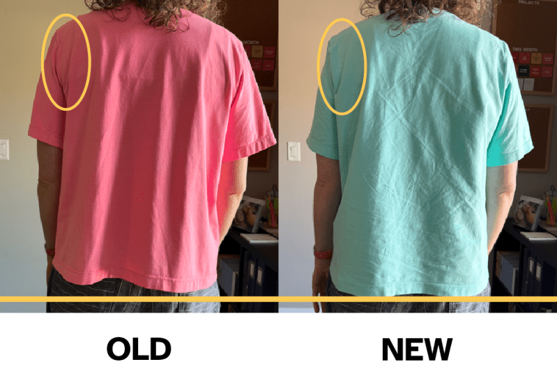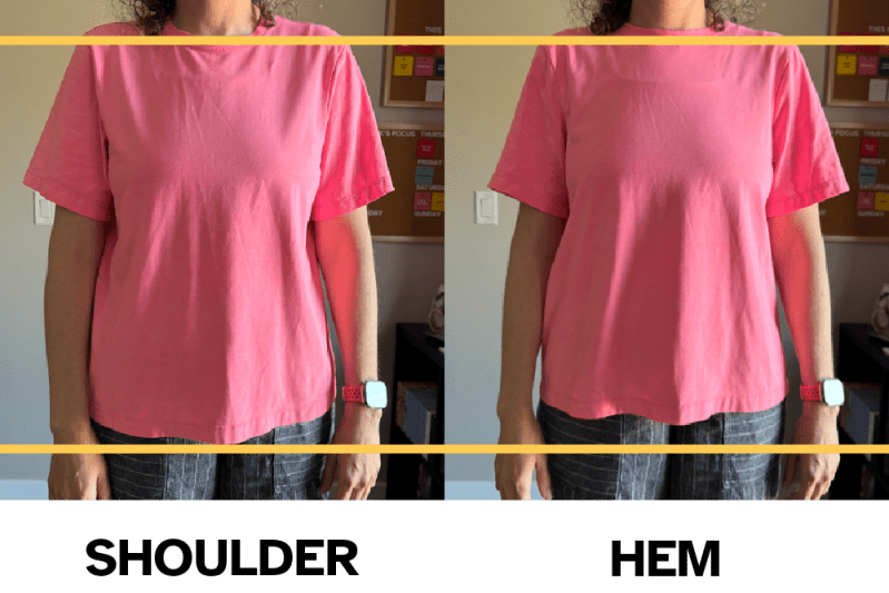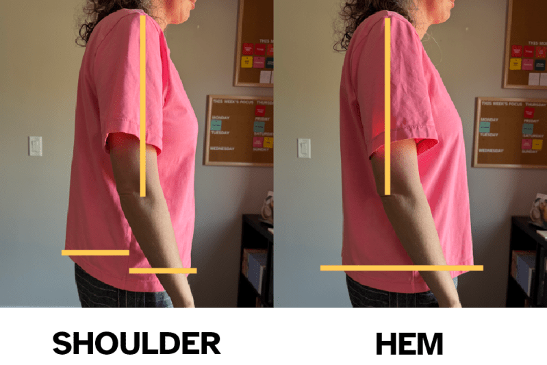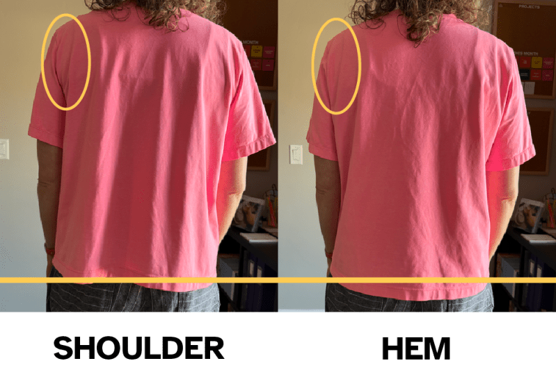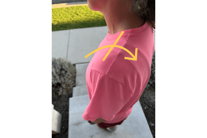 What happens throughout the day is the shirt wants to be balanced at the hem, so the shoulder seam inevitably gets pulled backwards. I’ve marked the top of my shoulder in the image above. You can see how far back the shoulder seam has to move in order to balance the hemline.