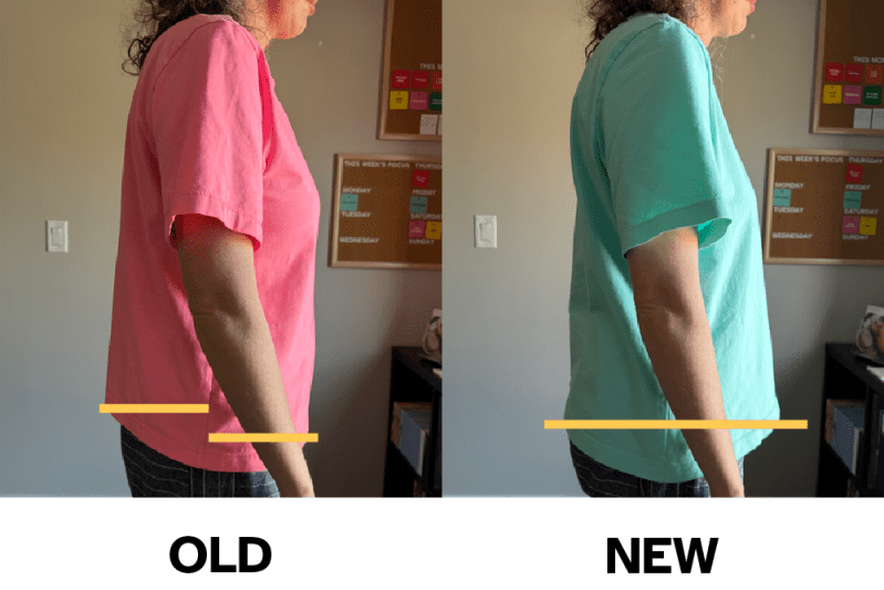 You can see where this is going. At some point, the fit of my shirts changed as I progressed from 10 pound up to 40 pound shoulder shrugs. I started noticing that my center front liked to push up into my neck, and I was fidgeting more and more with my shirt trying to keep it in place. Eventually, I grew so frustrated that my shirt would never stay put on my shoulders that I knew it was time…